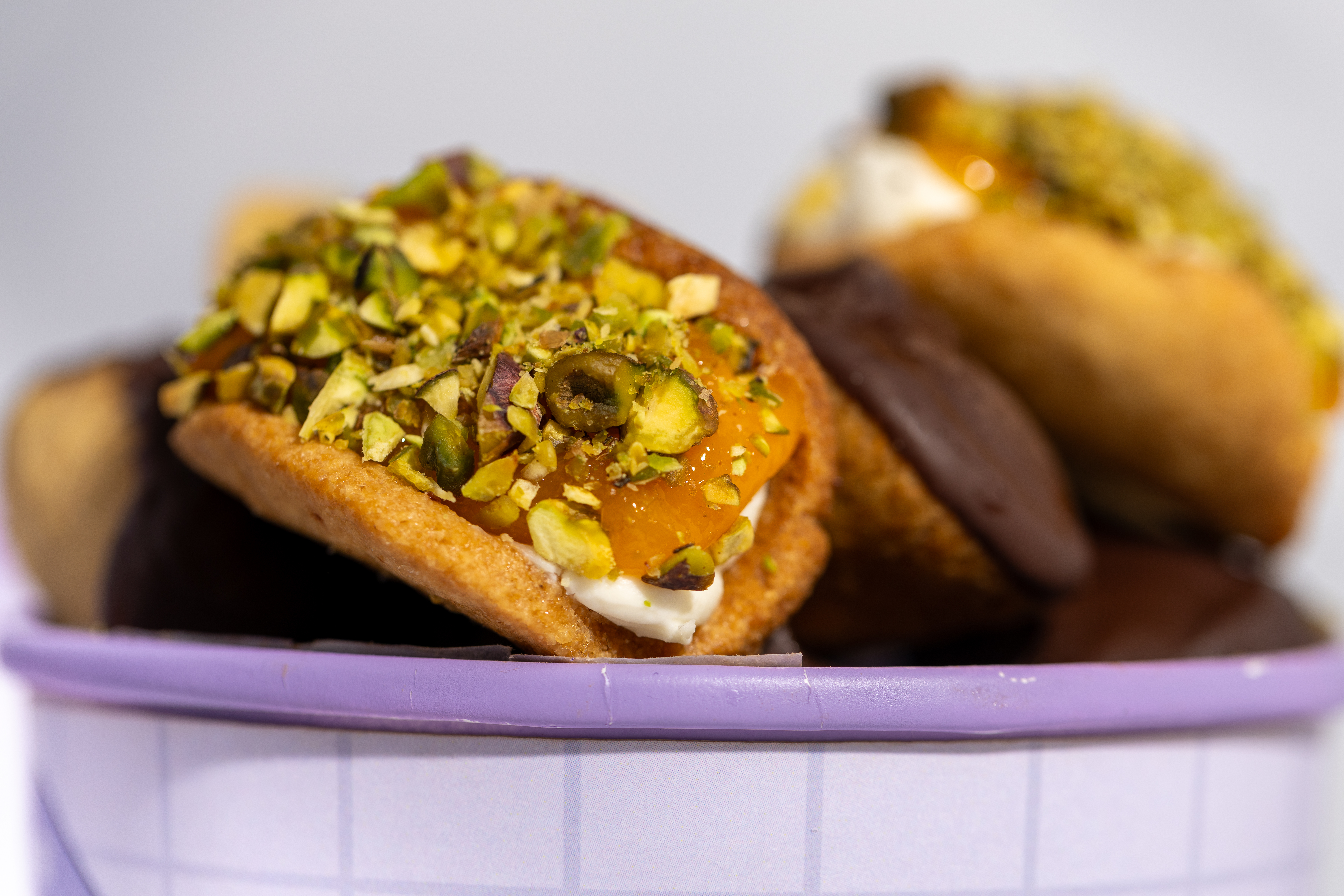 - Lava las frambuesas y corta algunas en mitades. Luego, en un molde, agrega el crumble, las frambuesas, el yogurt y finaliza con el spread y pistachos picados.