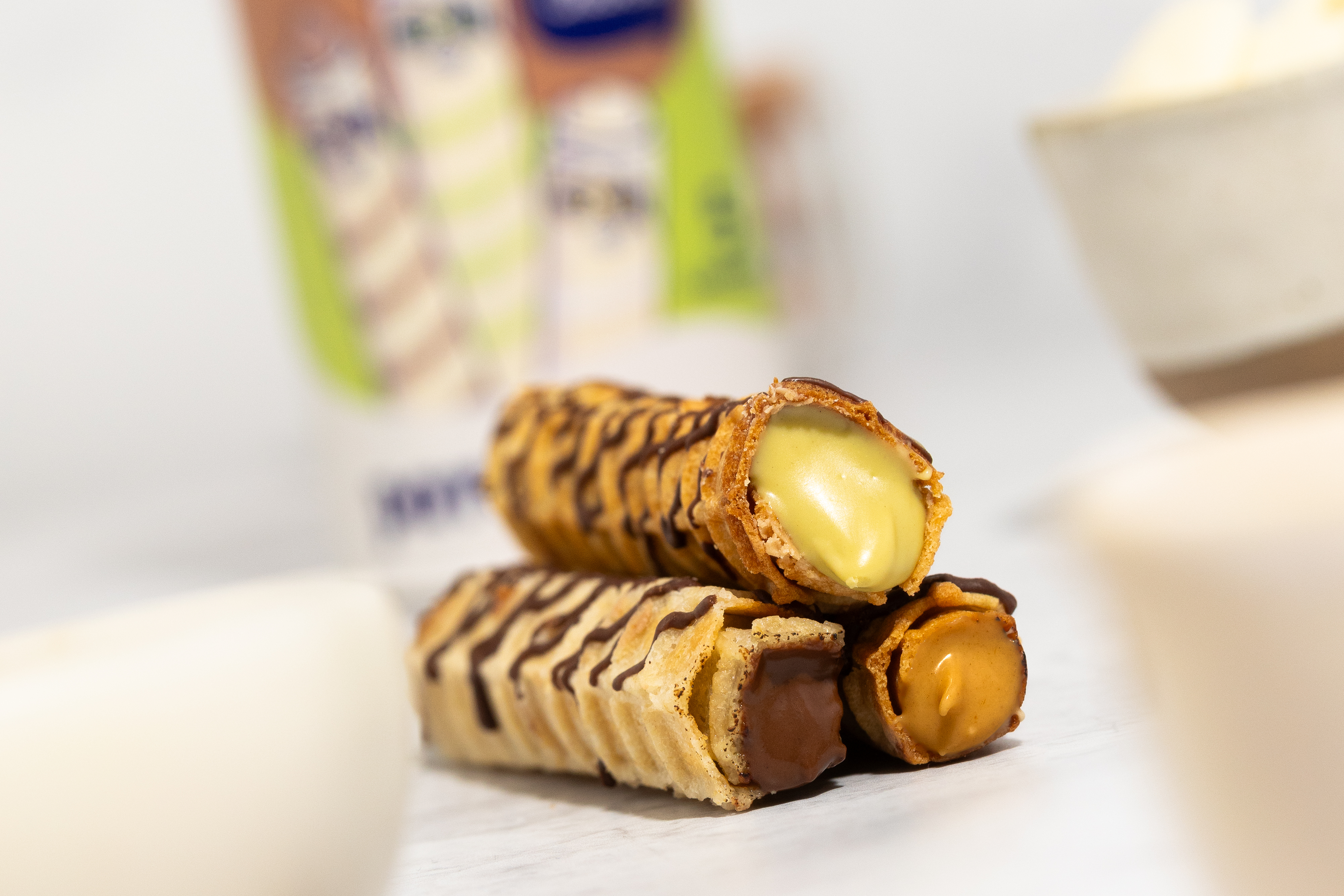 - En la batidora bate el queso crema hasta tener una textura suave. Añade la leche de coco, spread, 3 cucharadas de alulosa y zumo de limón. Integra hasta que tengas una crema sedosa y sin grumos.